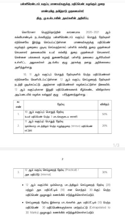 இந்நிலையில்,+2 மதிப்பெண் வழங்கும் முறை குறித்து,தற்போது முதல்வர் ஸ்டாலின் அறிவிப்பு வெளியிட்டுள்ளார்.அறிவிப்பின் படி,