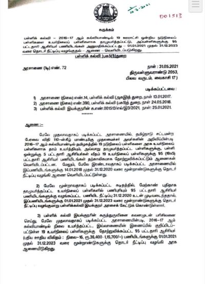 இப்பணியிடங்களுக்கு 14.01.2018 முதல் 31.12.2020 வரை மூன்றாண்டுகளுக்கு தொடர் நீட்டிப்பு வழங்கி ஆணை வெளியிடப்பட்டுள்ளது. இந்நிலையில், புதிதாக தாமுயர்த்தப்பட்ட உயர்நிலைப் பள்ளிகளில் பணிபுரியும் 95 பட்டதாரி ஆசிரியர் பணியிடங்களுக்கு வழங்கப்பட்ட பணியிட நீட்டிப்பு 31.12.2020 உடன் முடிவடைந்ததால், இப்பணியிடங்களுக்கு 01.012021 முதல் 31.12.2023 வரை மூன்றாண்டுகளுக்கு தொடர் நீட்டிப்பு வழங்குமாறு பள்ளிக்கல்வி இயக்குநர் அரசிடம் கோரிக்கை வைத்தார்.